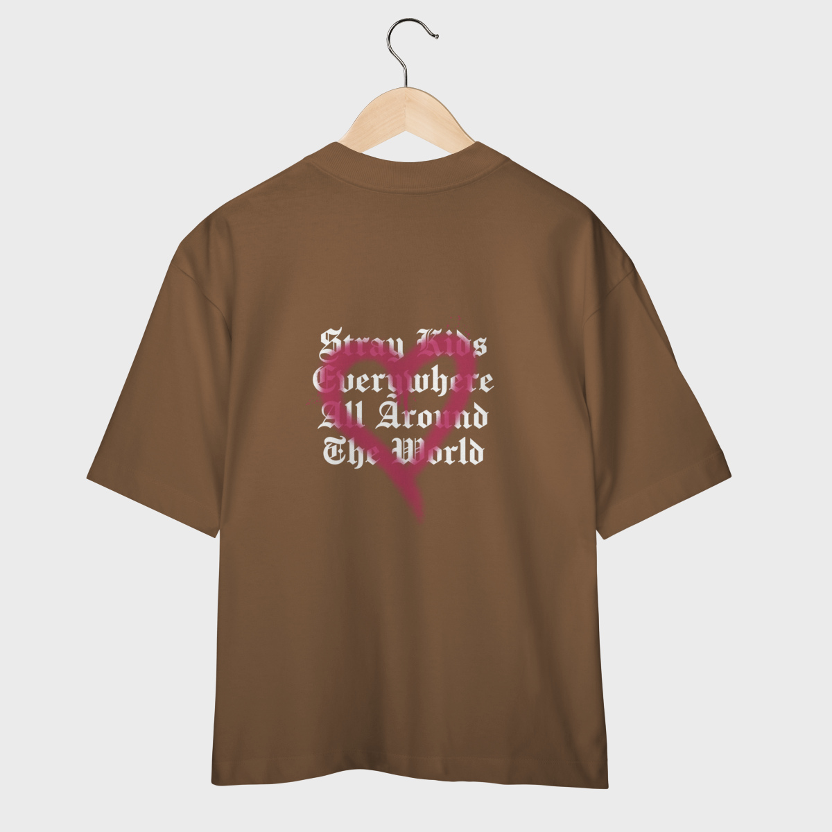 Camiseta oversized com estampa inspirada na jaqueta do Bangchan durante a Dominate: Celebrate tour